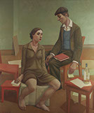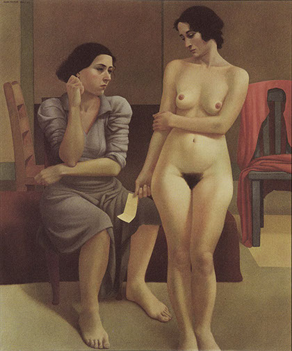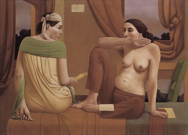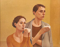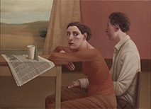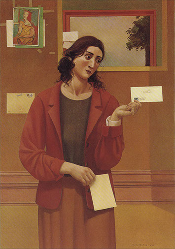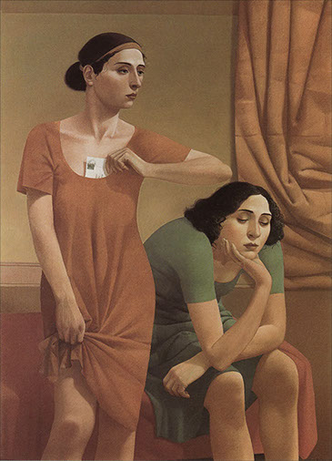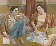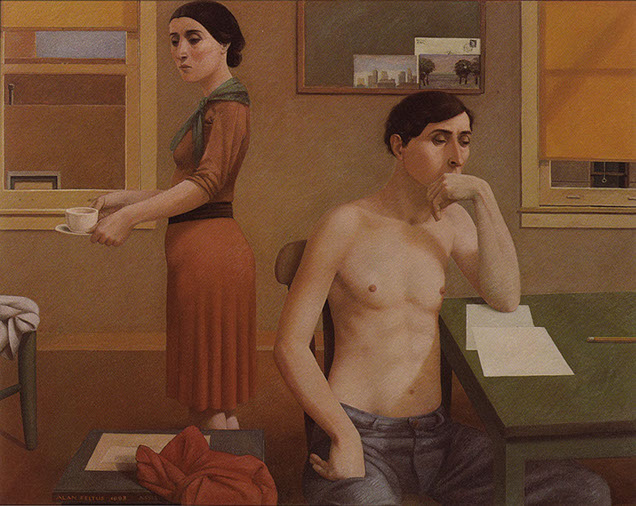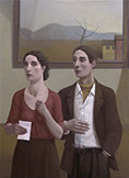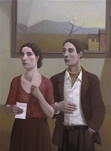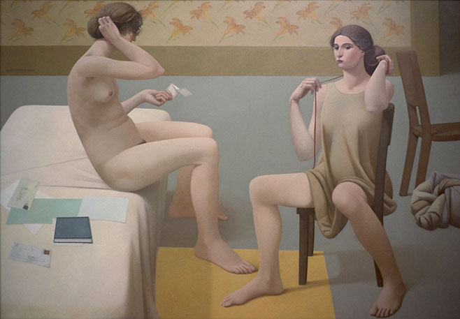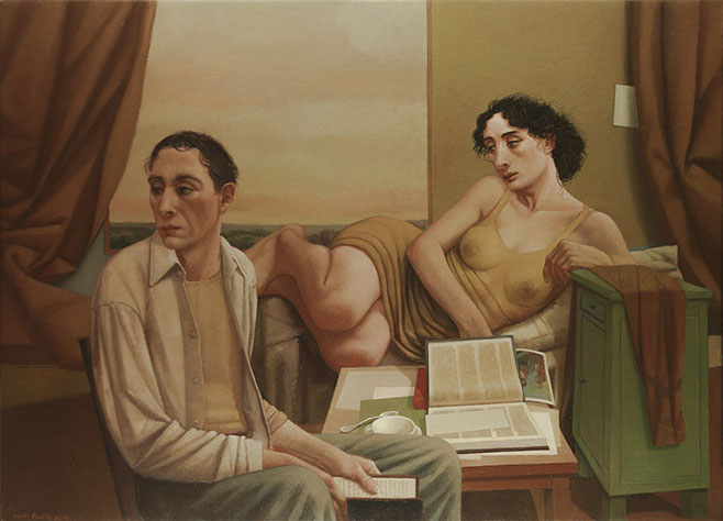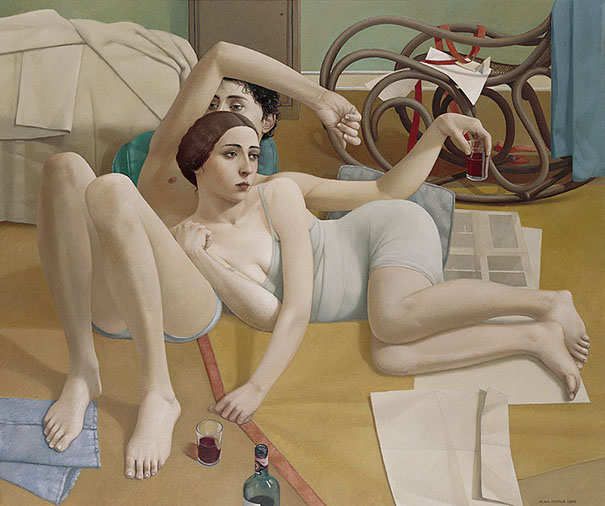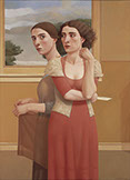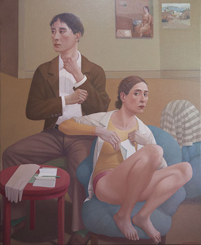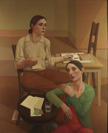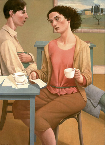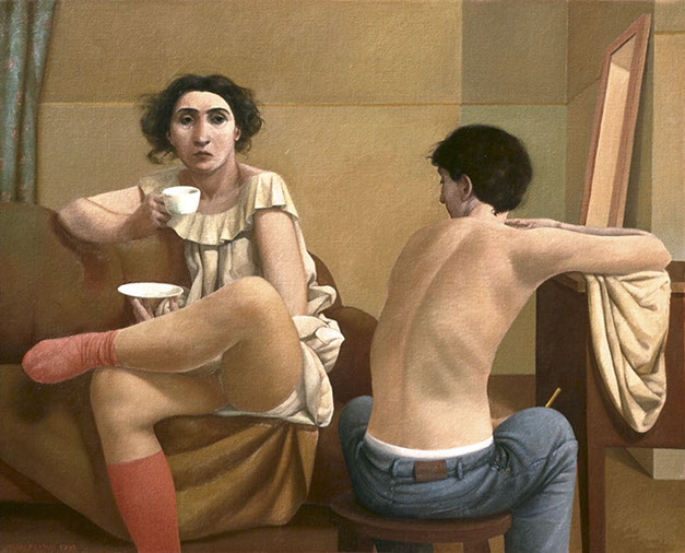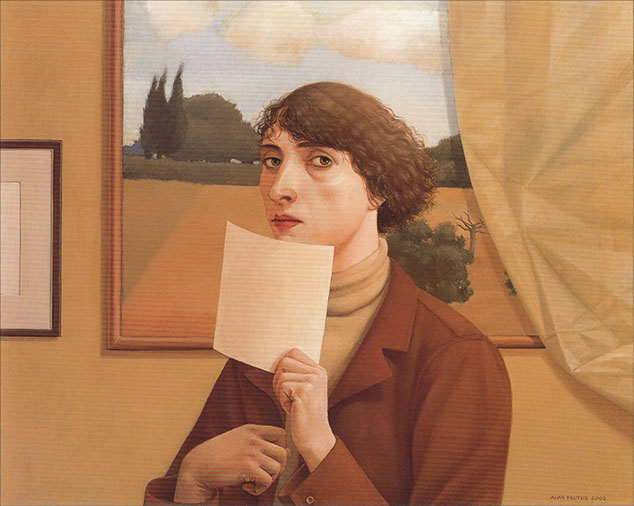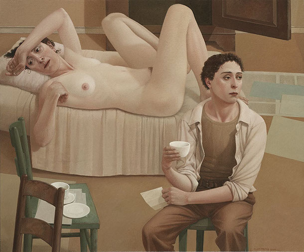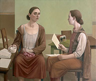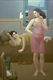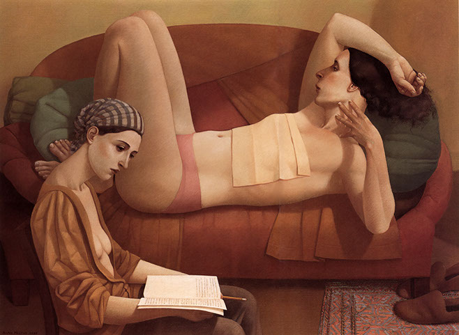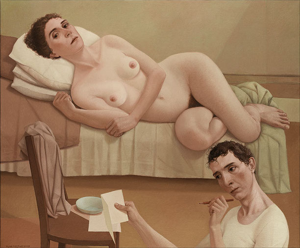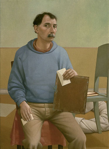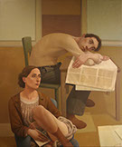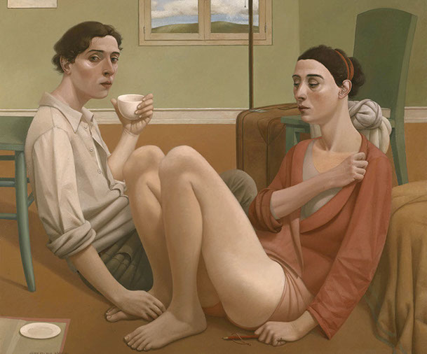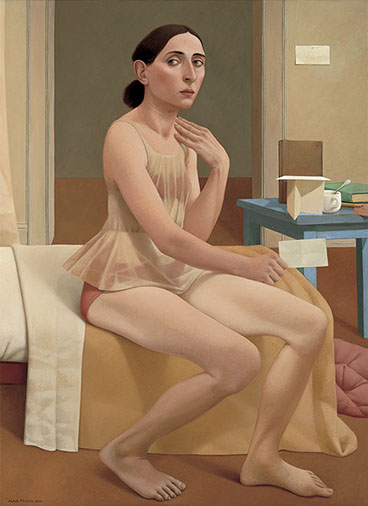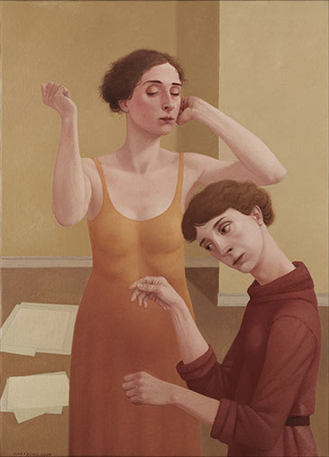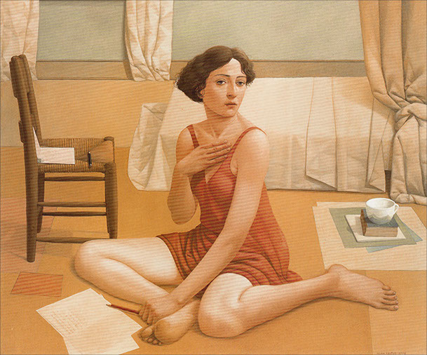 [...] My larger paintings take months to complete and go through a thousand small changes in addition to several quite big changes. A figure can disappear, or a figure can appear that wasn't there to begin with. A head turns, eyes shift in the direction of their gaze, an arm shifts, a book or a cup on a table will move. The table moves. A nude gets dressed or a dressed figure sheds her clothing. A chair turns to face the other direction. A wall moves back and a shadow divides it diagonally. Its color changes. A window becomes a landscape painting, or it is painted out.