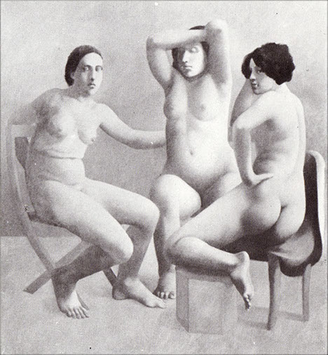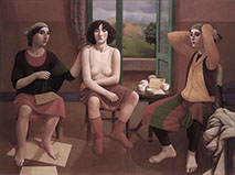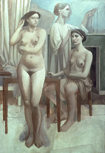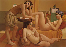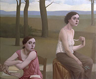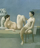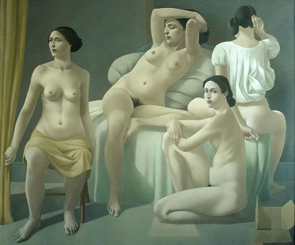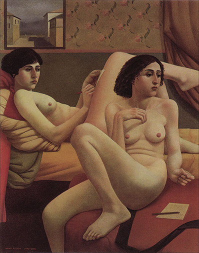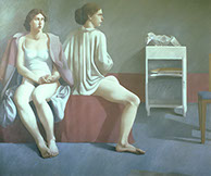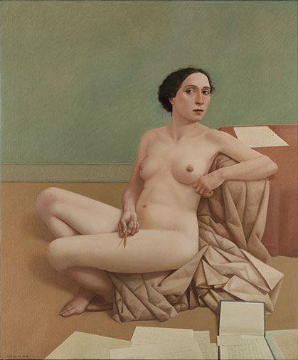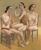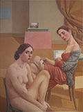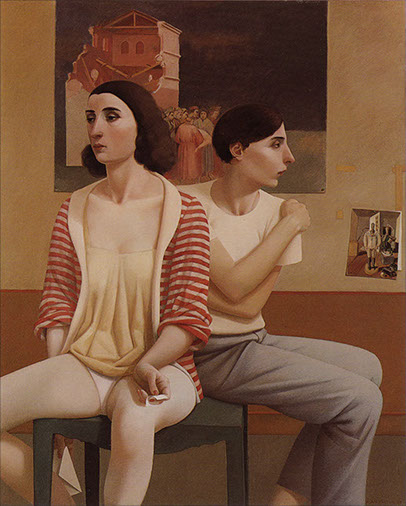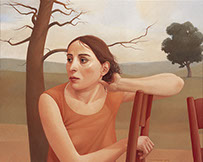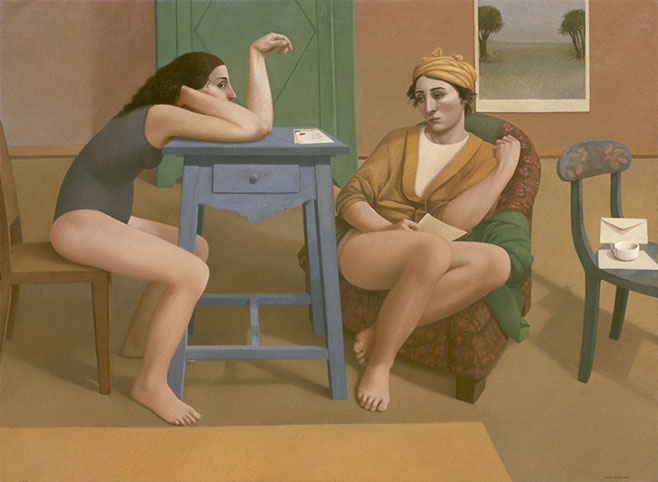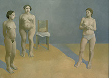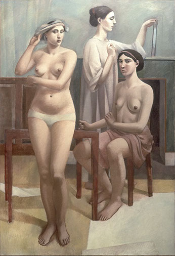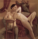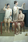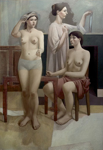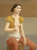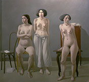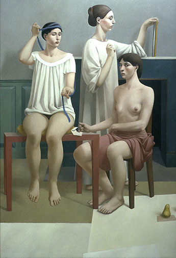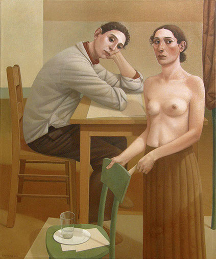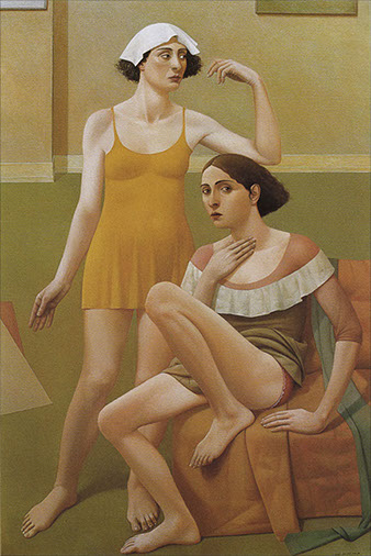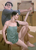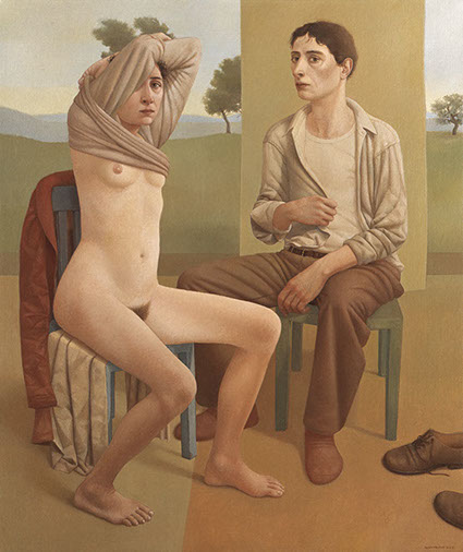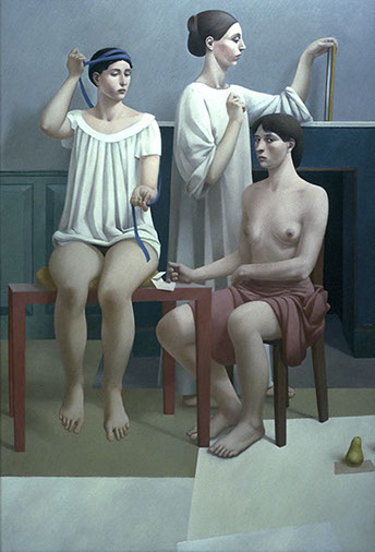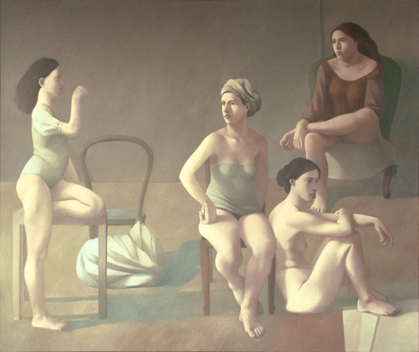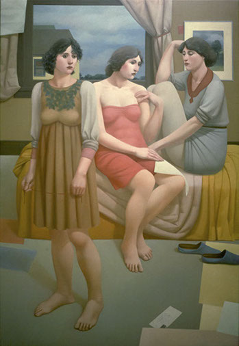 [...] Painting without models posing for me was a choice I made early on. I wouldn't have wanted my paintings to look like paintings of models in the way, for example, Philip Pearlstein's paintings do. Of course that doesn't have to be the case when painting from the model, and there were other reasons for me to work without a model. As a young painter on a very small teaching salary I couldn't afford to pay models to pose for me and I didn't want to ask friends to pose, but more than that I liked my studio time uncomplicated by the presence of another person. I value the solitude of my painting time. And I want to invent my figures as my paintings evolve. Finding the form of a figure is far more difficult without having a model to refer to than being able to look at a model.